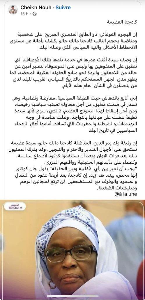 إن الهجوم الغوغائي، ذو الطابع العنصري الصريح، على شخصية ومناضلة بحجم النائب كادجتا مالك جالو يكشف بأمانة عن مستوى الانحطاط الأخلاقي والتيه السياسي الذي وصله البلد.