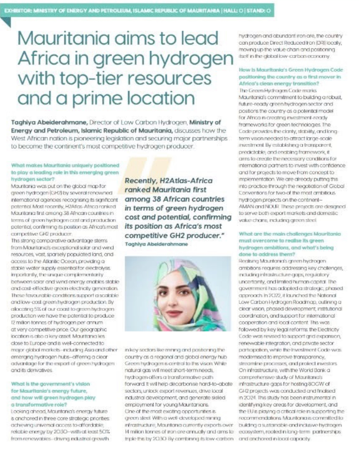 قالت مديرة الهيدروجين منخفض الكربون بوزارة الطاقة والنفط تقية منت عبيد الرحمن إن موريتانيا صنّفت في المرتبة الأولى من بين 38 دولة أفريقية من حيث تكلفة الهيدروجين الأخضر وإمكانات إنتاجه، وفق مشروع H2Atlas-Africa الألماني.