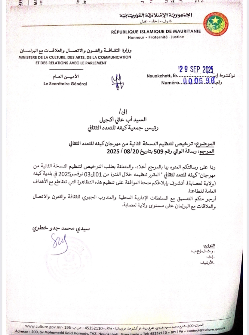 Oct 01 / التعليقات التحضير جار لإطلاق "مهرجان كيفه للتعدد الثقافي"(وقيقة ) الصور المرفقة من النسخة الأولى رخصت وزارة الثقافة لجمعية كيفه للتعدد الثقافي التي يرأسها السيد أب عال ولد آكجيل مهرجانا بعنوان" "مهرجان كيفه للتعدد الثقافي" ستنطلق فعالياته في نسخته الثانية في 1 نوفمبر 2025 وذلك على مدى 3 أيام. أربعاء, 2025/10/01 - 09:59 إضافة تعليق جديد اسمك التعليق About text formats Restricted HTML وسوم إتش.تي.إم.إل المسموح بها: <a href hreflang> <em> <strong> <cite> <blockquote cite> <code> <ul type> <ol start type> <li> <dl> <dt> <dd> <h2 id> <h3 id> <h4 id> <h5 id> <h6 id> تفصل السطور و الفقرات تلقائيا. Web page addresses and email addresses turn into links automatically.