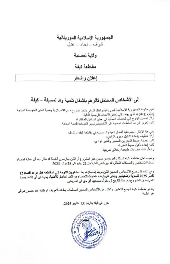 كيفه: إعلان من مشروع مدن للمعنيين باشغال تنمية وادي لمسيله