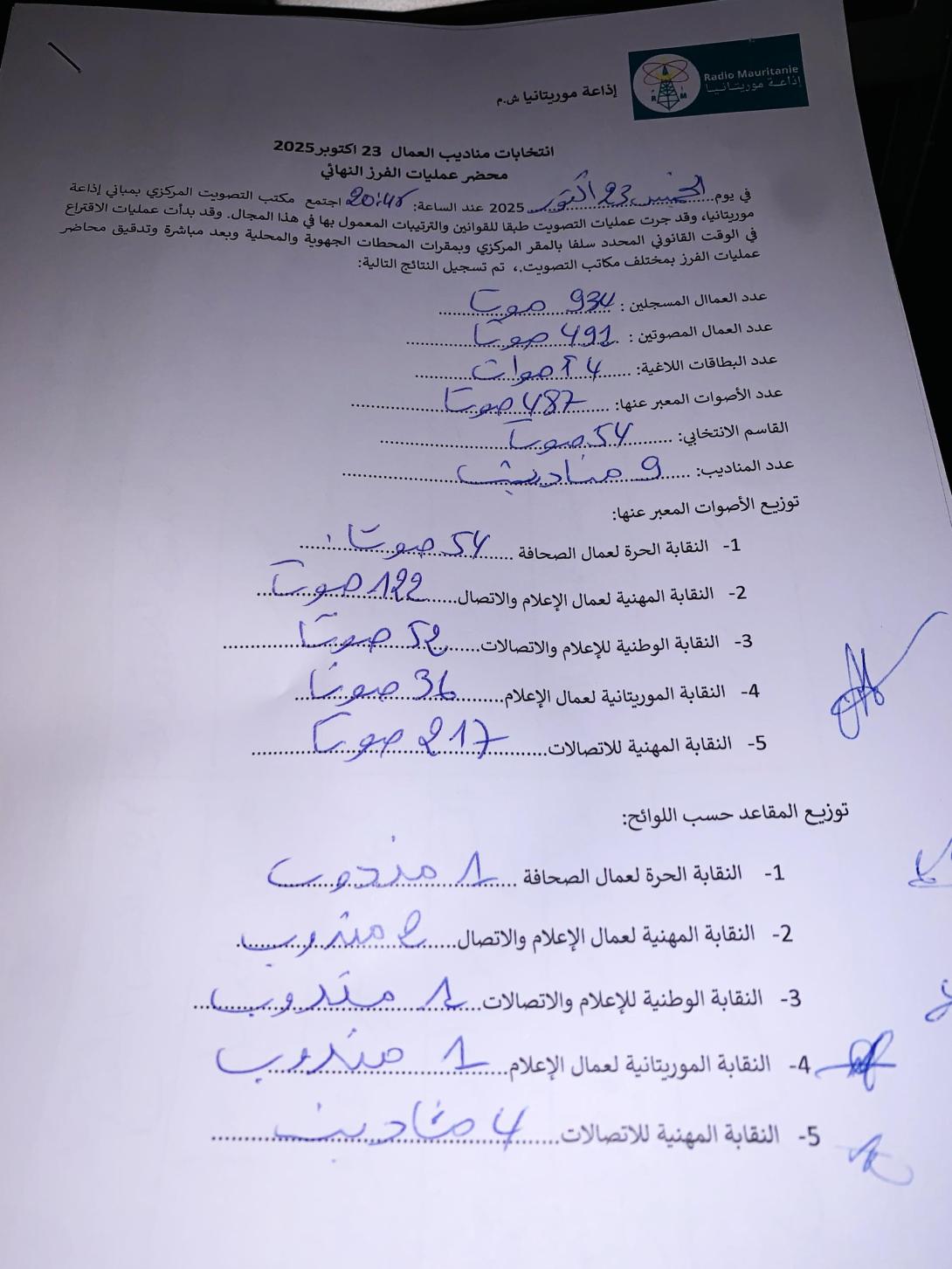 تصدرت النقابة المهنية للاتصالات انتخابات مناديب عمال إذاعة موريتانيا، حيث حصلت على أربعة مقاعد من أصل تسعة. وحصلت النقابة المهنية لعمال الإعلام والاتصال على مقعدين، فيما حصلت كل من النقابة الحرة لعمال موريتانيا والنقابة الوطنية للإعلام والاتصال والنقابة الموريتانية لعمال الإعلام على مقعد واحد لكل منها.