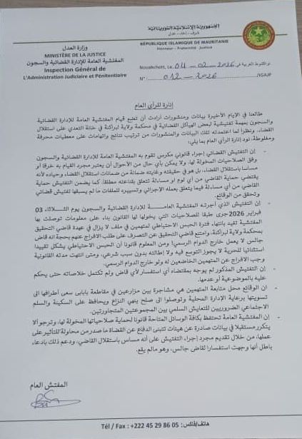 طالعنا في الإيام الأخيرة بيانات ومنشورات أرادت أن تضع قيام المفتشية العامة للإدارة القضائية والسجون بمهمة تفتيشية لبعض الهياكل القضائية في محكمة ولاية لبراكنة في خانة التعدي على استقلال القضاء. ونظراً لما اعتمدته تلك البيانات والمنشورات من ترتيب نتائج واتهامات على معطيات محرفة ومغلوطة، نود إنارة الرأي العام بما يلي: