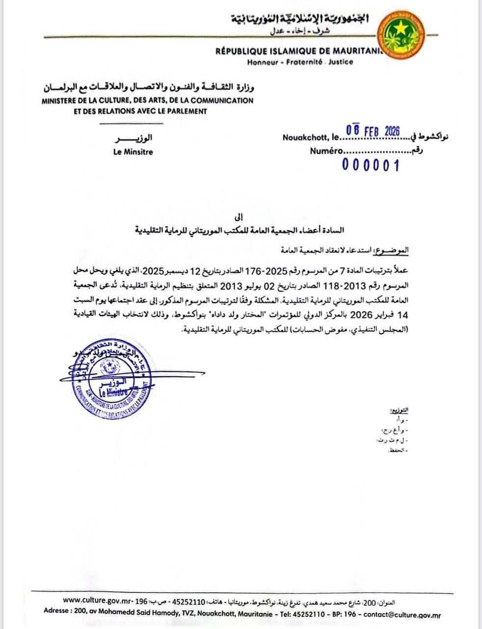 Feb 06 / التعليقات وزير الثقافة يستدعي الجمعية العامة للرماية للانعقاد من أجل انتخاب هيئاتها(وثيقة ) جمعة, 2026/02/06 - 15:03 إضافة تعليق جديد اسمك التعليق About text formats Restricted HTML وسوم إتش.تي.إم.إل المسموح بها: <a href hreflang> <em> <strong> <cite> <blockquote cite> <code> <ul type> <ol start type> <li> <dl> <dt> <dd> <h2 id> <h3 id> <h4 id> <h5 id> <h6 id> تفصل السطور و الفقرات تلقائيا. Web page addresses and email addresses turn into links automatically.