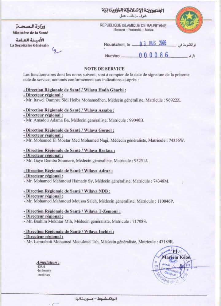 وشملت المذكرة تحويل 27 طبيبا أخصائيا إلى أماكن عمل جديدة في مستشفيات في العاصمة نواكشوط، وفي بعض المدن الداخلية.