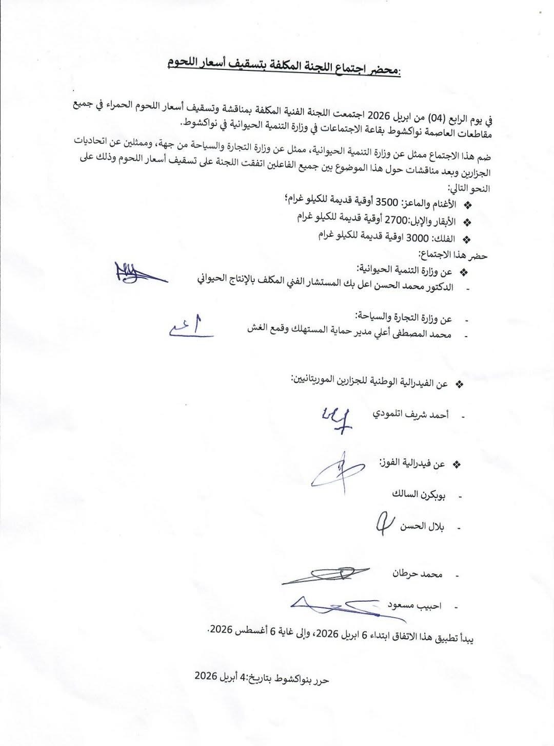وينص التسقيف على تحديد سعر كيلوغرام لحم الضأن والماعز بـ3500 أوقية قديمة، و2700 أوقية قديمة لكل كيلوغرام من لحم الإبل والبقر، فيما حُدد سعر كيلوغرام الفلكه بـ3000 أوقية قديمة، وفق بيان صادر عن وزارة التنمية الحيوانية.