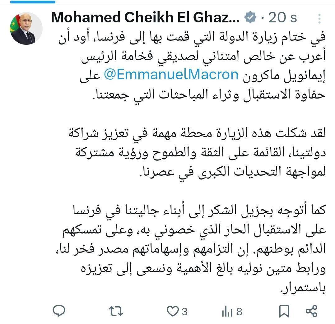 وأوضح ولد الغزواني، في تدوينة عبر منصة "X"، أن العلاقة بين موريتانيا وفرنسا تستند إلى رؤية مشتركة لمواجهة التحديات الكبرى في المرحلة الراهنة، مؤكدا أن المباحثات التي أجراها خلال الزيارة عكست تقاربا في وجهات النظر حول عدد من القضايا.