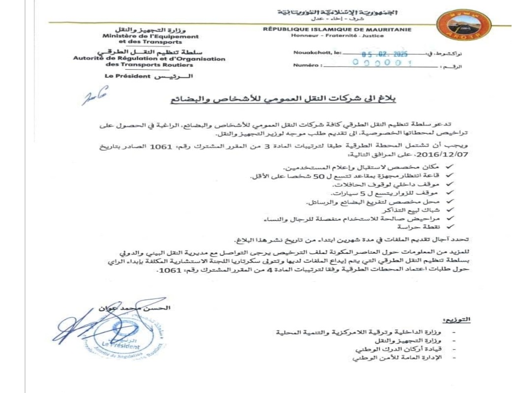 وحددت السلطة في بلاغها فترة استقبال الملفات لتمتد إلى شهرين من يوم صدور البلاغ، وتودع لدى مديرية النقل البيني والدولي بالسلطة.