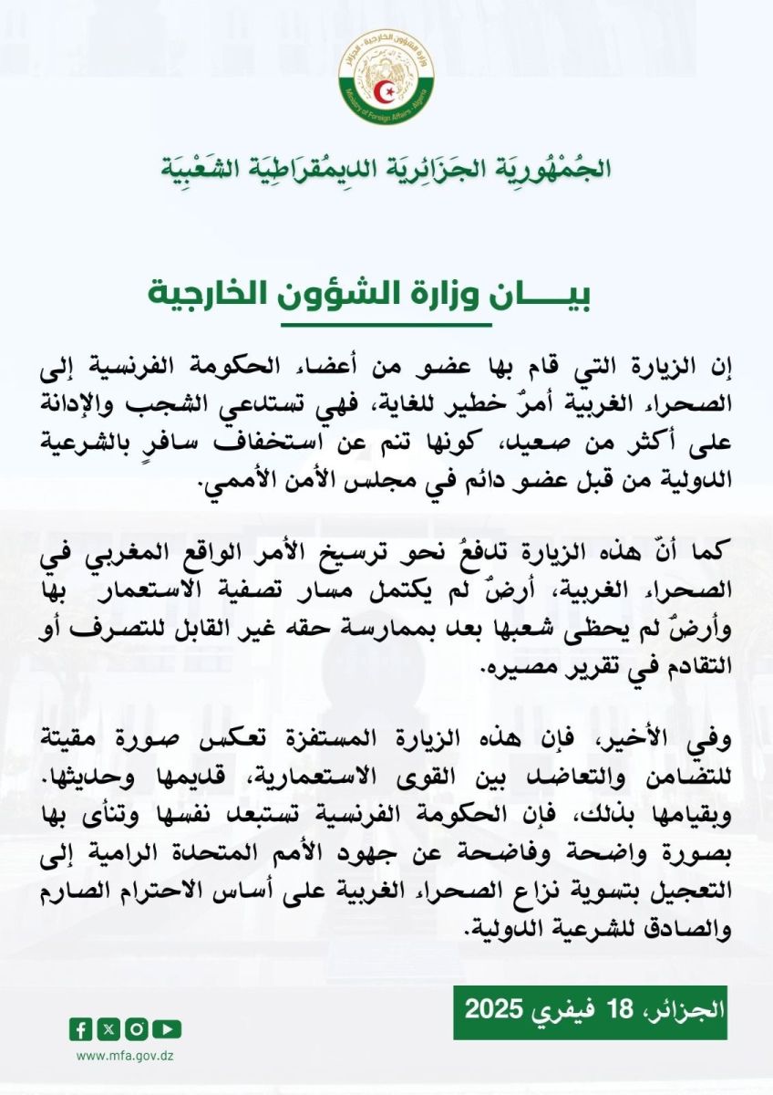 Feb 18 / التعليقات الجزائر تدين زيارة مسؤول حكومي لمدينة لعيون الصحراوية ثلاثاء, 2025/02/18 - 13:23 إضافة تعليق جديد اسمك التعليق About text formats Restricted HTML وسوم إتش.تي.إم.إل المسموح بها: <a href hreflang> <em> <strong> <cite> <blockquote cite> <code> <ul type> <ol start type> <li> <dl> <dt> <dd> <h2 id> <h3 id> <h4 id> <h5 id> <h6 id> تفصل السطور و الفقرات تلقائيا. Web page addresses and email addresses turn into links automatically.