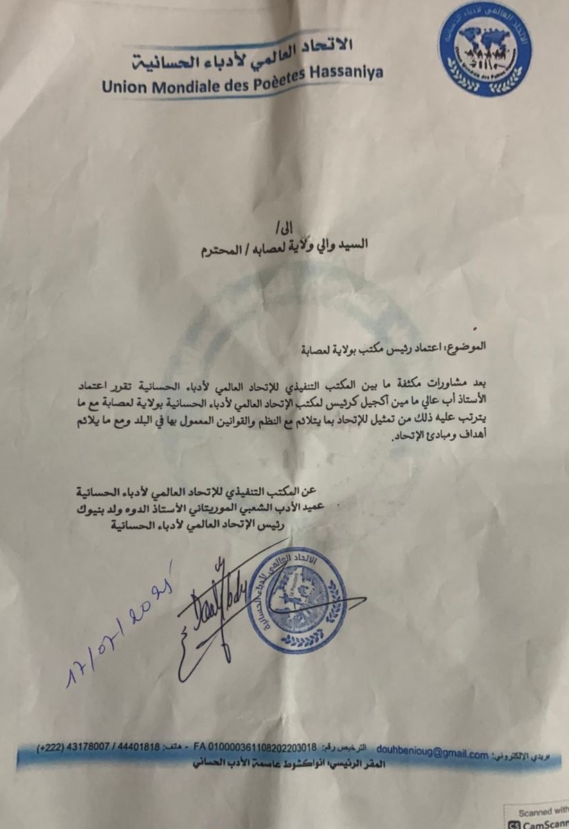 Jul 21 / التعليقات ولد آكجيل رئيسا للمكتب التنفيذي للاتحاد العالمي لأدباء الحسانية في ولاية لعصابه (وثيقة) الأديب أب عال مامين اكجيل قرر الاتحاد العالمي لأدباء الحسانية اعتماد الأديب أب عال مامين اكجيل رئيسا لمكتبه الجهوي على مستوى ولاية لعصابه.ويعد هذا الأديب أحد أبرز شعراء الحسانية في موريتانيا، وقد اشتهر بالالتزام بقضايا المجتمع والانحياز لهموم الجماهير وفي هذا الاتجاه تركز إنتاجه الأدبي. اثنين, 2025/07/21 - 11:36 إضافة تعليق جديد اسمك التعليق About text formats Restricted HTML وسوم إتش.تي.إم.إل المسموح بها: <a href hreflang> <em> <strong> <cite> <blockquote cite> <code> <ul type> <ol start type> <li> <dl> <dt> <dd> <h2 id> <h3 id> <h4 id> <h5 id> <h6 id> تفصل السطور و الفقرات تلقائيا. Web page addresses and email addresses turn into links automatically.