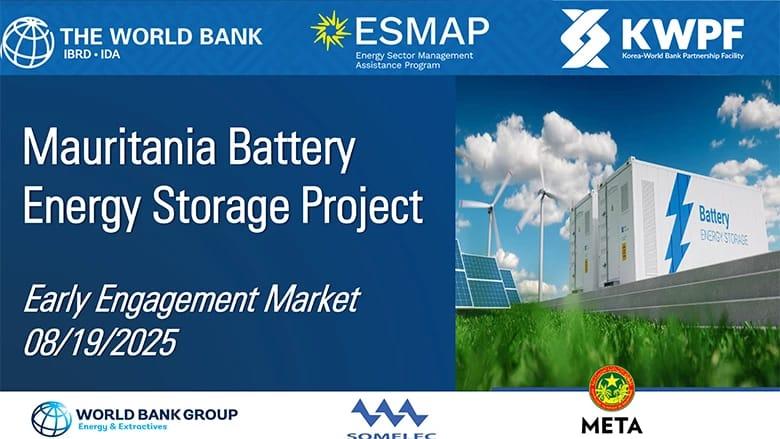 يعتزم البنك الدولي تنظيم فعالية يوم 19 أغسطس 2025، لدراسة جدوى واستشارات هندسية واقتصادية بهدف تمويل مشروع تخزين الطاقة بالبطاريات في موريتانيا.