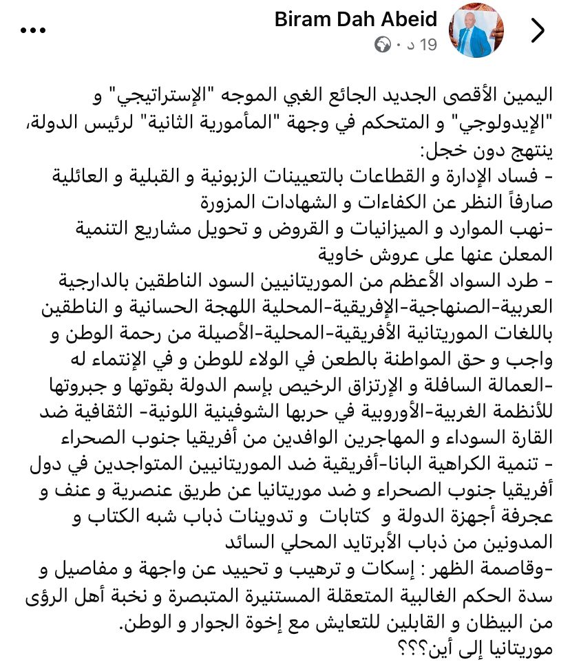 Oct 03 / التعليقات النائب برام الداه اعبيد يكتب: موريتانيا إلى أين؟ كتب رئيس حركة إيرا النائب البرلماني برام الداه اعبيد على صفحة على الفبسبوك ما يلي: جمعة, 2025/10/03 - 10:30 إضافة تعليق جديد اسمك التعليق About text formats Restricted HTML وسوم إتش.تي.إم.إل المسموح بها: <a href hreflang> <em> <strong> <cite> <blockquote cite> <code> <ul type> <ol start type> <li> <dl> <dt> <dd> <h2 id> <h3 id> <h4 id> <h5 id> <h6 id> تفصل السطور و الفقرات تلقائيا. Web page addresses and email addresses turn into links automatically.
