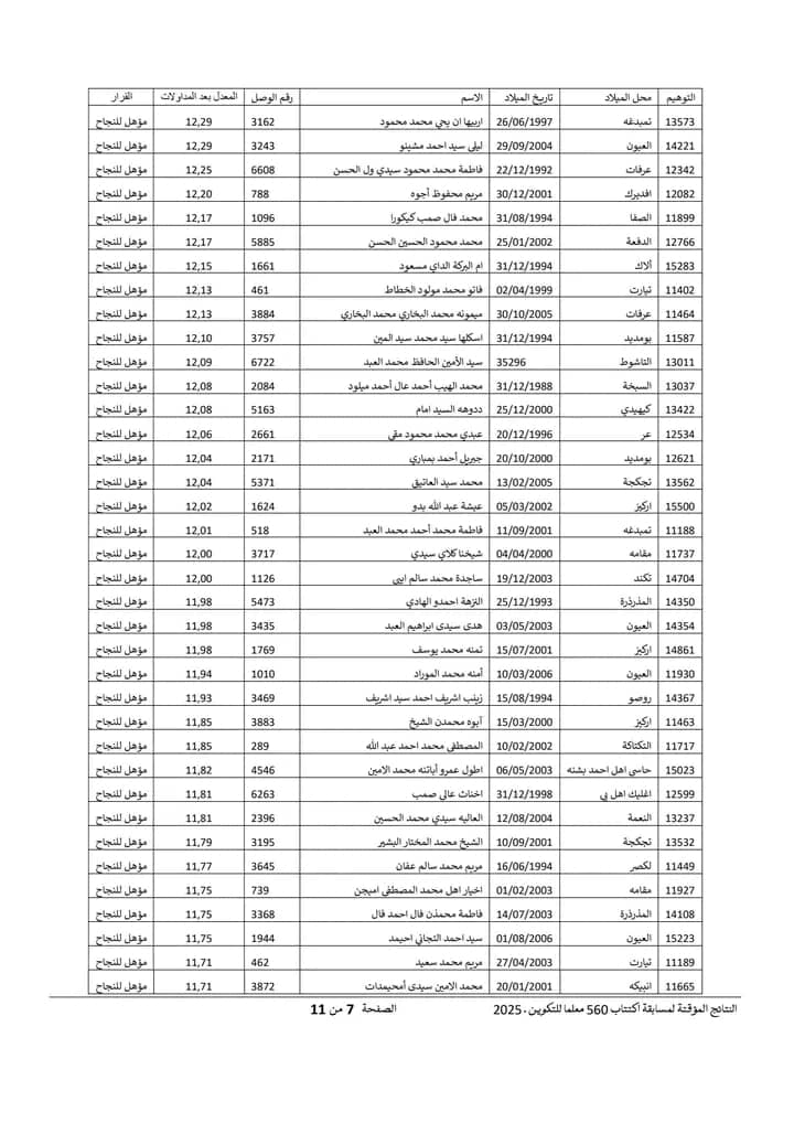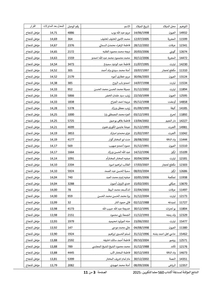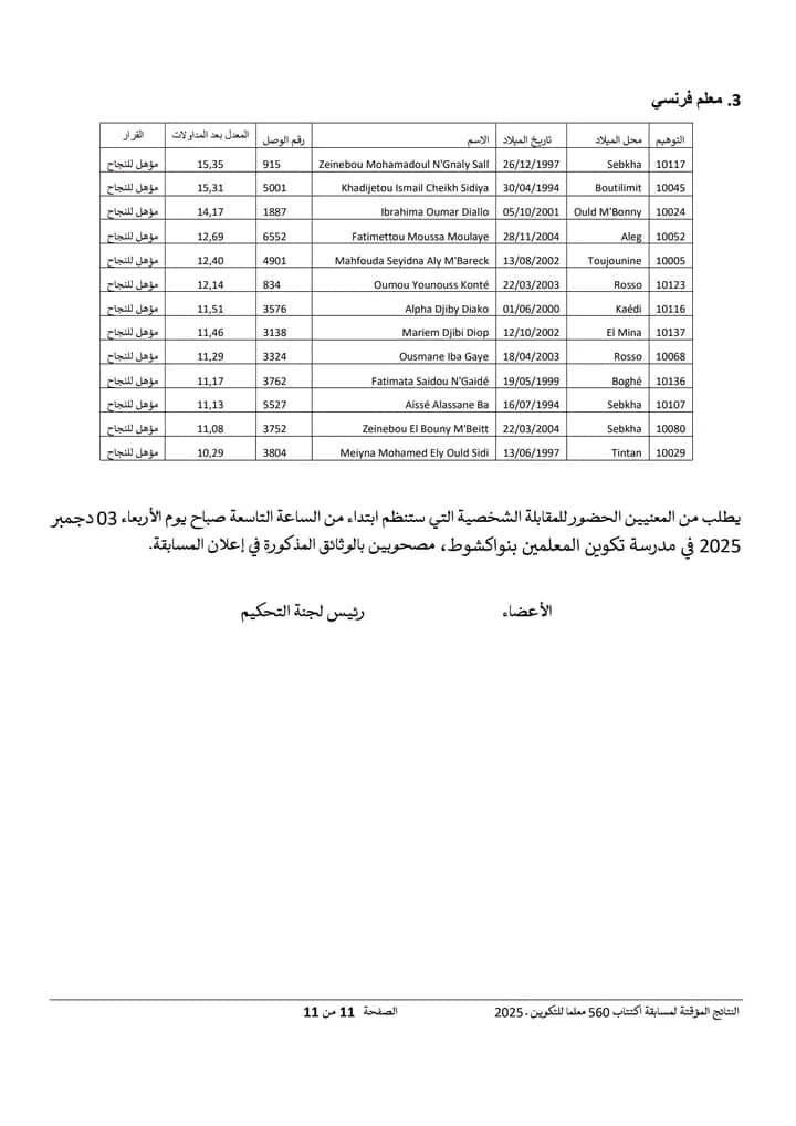 Nov 18 / التعليقات إعلان نتائج مسابقة مقدمي خدمات التعليم لسنة 2025 أعلنت وزارة التربية وإصلاح النظام التعليمي عن نتائج مسابقة مقدمي خدمات التعليم لسنة 2025.وتتيح هذه النتائج للمشاركين في المسابقة الاطلاع على أسماء الناجحين والناجحات الذين سيتم دمجهم ضمن الطواقم التربوية في مختلف المؤسسات التعليمية الوطنية. https://www.education.gov.mr/ar/node/1047 ثلاثاء, 2025/11/18 - 20:12 إضافة تعليق جديد اسمك التعليق About text formats Restricted HTML وسوم إتش.تي.إم.إل المسموح بها: <a href hreflang> <em> <strong> <cite> <blockquote cite> <code> <ul type> <ol start type> <li> <dl> <dt> <dd> <h2 id> <h3 id> <h4 id> <h5 id> <h6 id> تفصل السطور و الفقرات تلقائيا. Web page addresses and email addresses turn into links automatically.