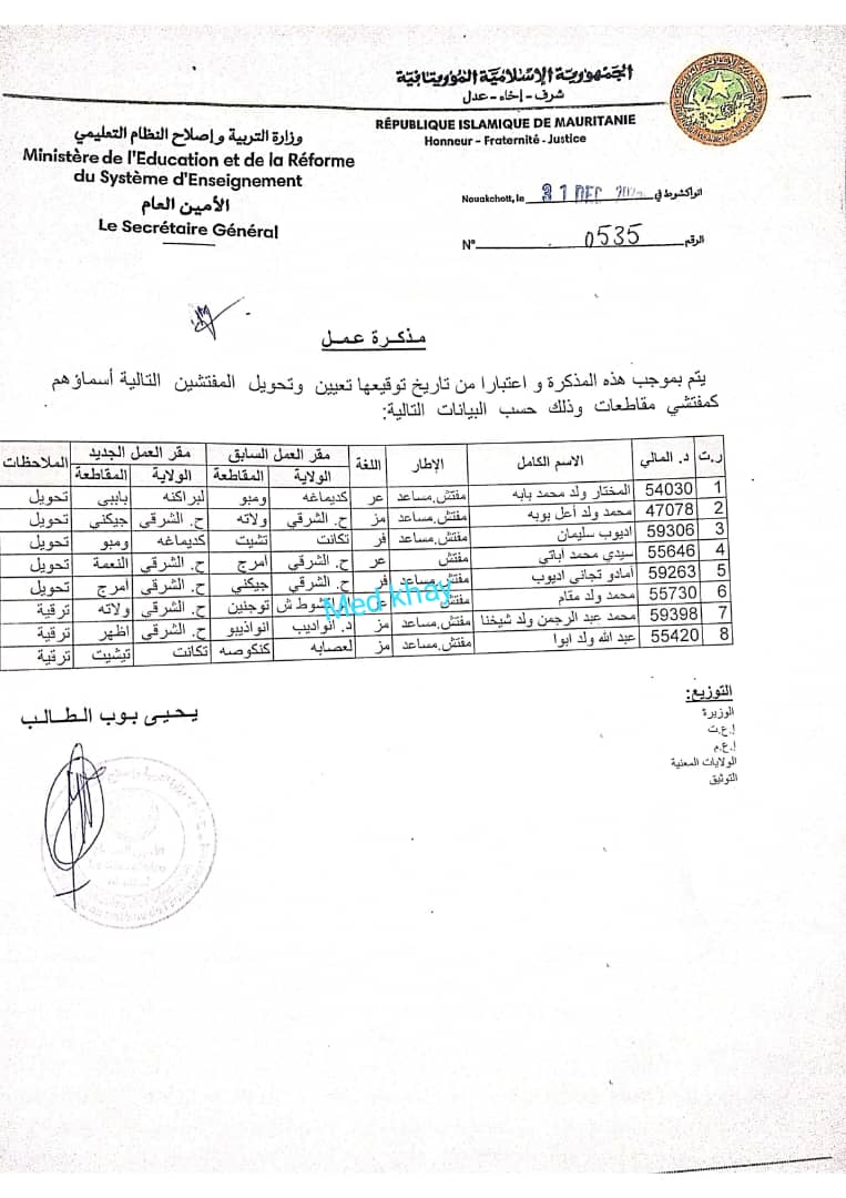 بموجب مذكرة عمل صادرة عن وزارة التربية وإصلاح النظام التعليمي يوم أمس ال 31 دجمبر 2025 تم تعيين الأخ والصديق المفتش محمد عبد الرحمن ولد شيخنا مفتشا مقاطعيا لمقاطعة اظهر بولاية الحوض الشرقي ، ضمن تعيينات أخرى.